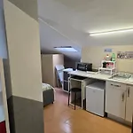 Une kitchenette est équipée d'un réfrigérateur, d'une table de cuisson et d'une vaisselle adapté pour cuisiner.
